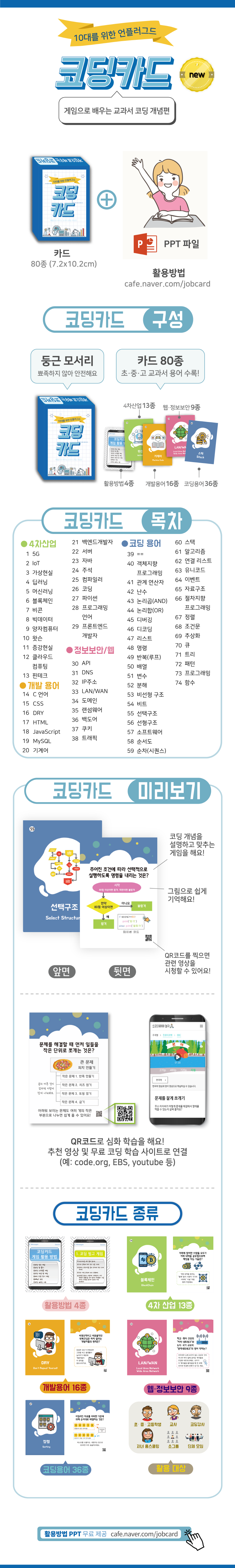 <코딩카드>는 80종 퀴즈 게임 카드로 초·중·고등학교 교과서에 수록된 코딩 개념 키워드를 재미있게 익힐 수 있다. 코딩 개념 카드는 이미지로 쉽게 기억할 수 있도록 구성했고 수업 시간에 친구들과 함께 학습할 수 있는 활용방법 카드도 수록했다.
