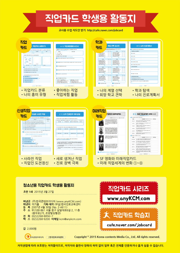 -부록으로 실려 있는 “나의 꿈을 위한 실천 나무 / 나의 꿈카드 만들기 / 나의 직업카드 만들기”는 학생들이 반복해서 사용할 수 있도록 PDF(컬러, 고해상도)로 올려놨습니다. ‣카페 자료실 (http://cafe.naver.com/jobcard) 누구나 다운로드 가능하오니 많은 활용 바랍니다.