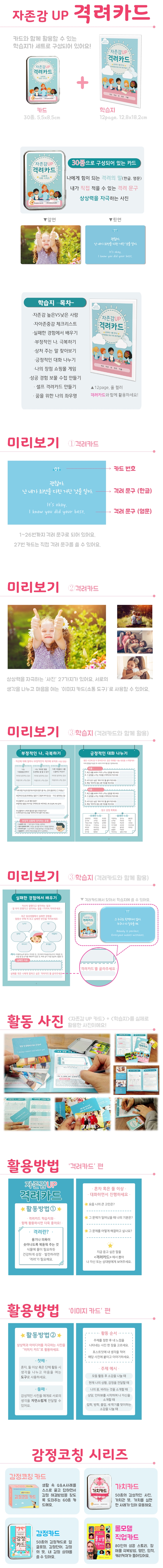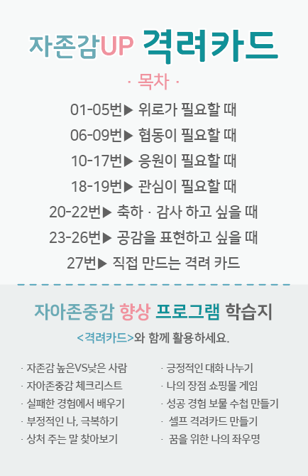 <자존감 UP 격려카드>는 30종의 카드와 12page의 학습지로 구성되어 있다. <자존감 UP 격려카드> 앞면에는 상상력을 자극하는 사진이 있어서 “이미지 카드”로 사용할 수 있다. 뒷면에는 나에게 힘이 되는 ‘격려의 말(한글· 영어)’이 적혀있다. <자존감 UP 격려카드> 를 다양하게 활용할 수 있는 <긍정적인 나를 만드는 자아존중감 향상 프로그램 학습지>가 함께 제공되어 더욱 유용하다.