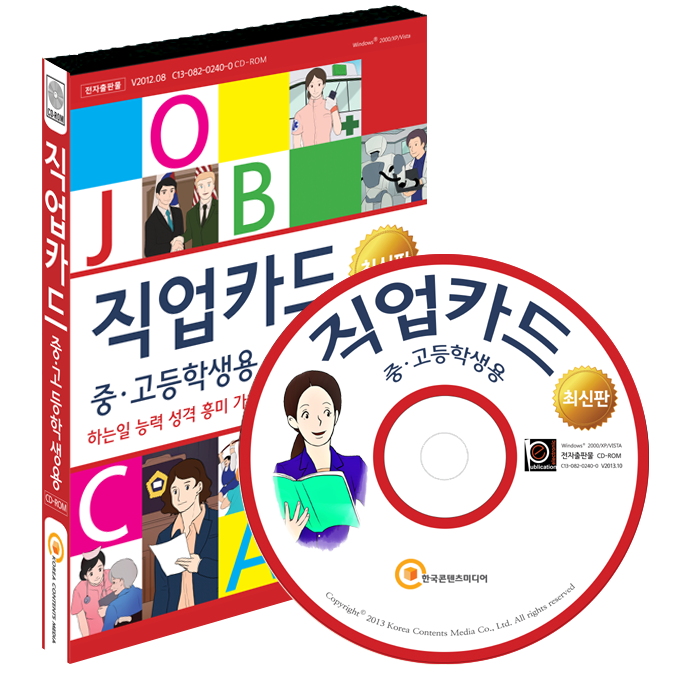 <<직업카드 CD롬(중고등학생용 최신판)>>은 PPT(파워포인트) 파일로 100가지 직업정보를 살펴보는 교재입니다. 미래에 유망한 직업, 새로 생긴 직업, 인기 있는 직업, 주변에서 많이 볼 수 있는 직업 등 100가지 주요 직업을 선별하여 소개했습니다. 직업 분야별(개인서비스, 건축․토목, 경영․금융, 공공․법률, 과학․공학, 교육․연구, 문화․방송, 사회․복지, 예술․미용, 운동․신체, 의료․보건, 자연․환경, 정보․통신, 항공․해양)로 100가지 직업을 수록했습니다.