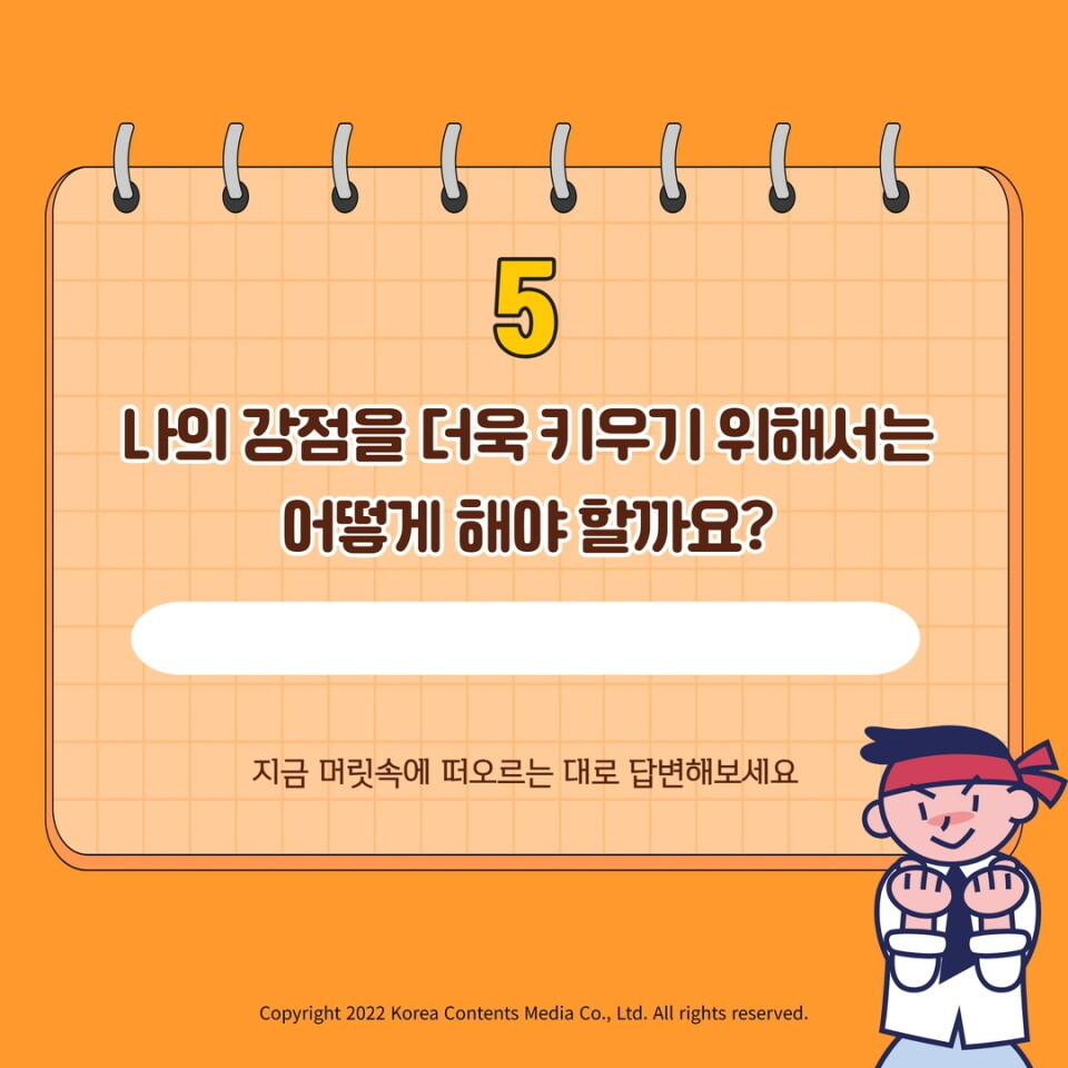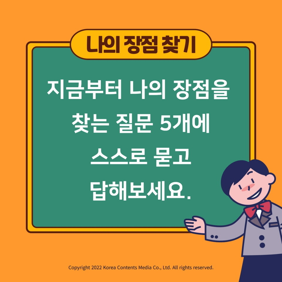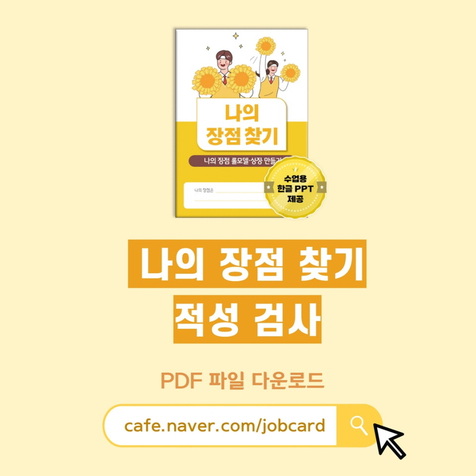 11) 검색키워드 : 장점카드, 강점카드, 강점찾기, 장점찾기, 인성교육, 진로적성검사, 다중지능, 장단점, 나의장점, 나의단점, 롤모델, 존경하는인물, 내가 잘하는 것, 내가 좋아하는 것, 자신감키우기, 자신감결여, 슬럼프극복, 적성검사, 나의장점찾기, 상장만들기